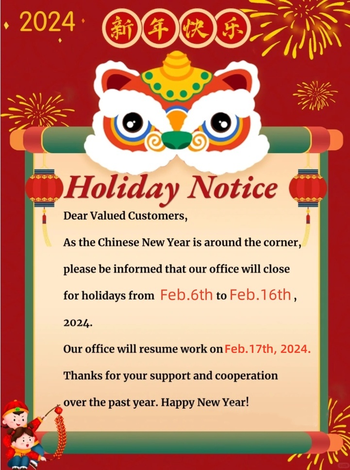 please be informed that our office will close for holidays from Feb.6th to Feb.17th, 2024.