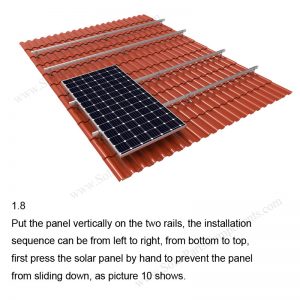 1.8 Put the panel vertically on the two rails, the installation sequence can be from left to right, from bottom to top, first press the solar panel by hand to prevent the panel from sliding down, as picture 10 shows.